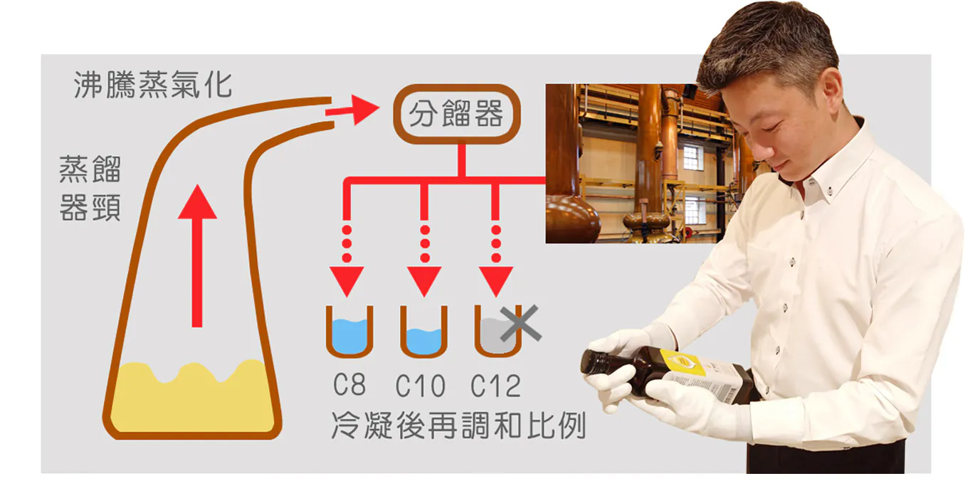 雖說很多椰子油標榜經過冷壓初搾後,可以精煉成MCT中鏈脂肪酸油,但是內行的人才知道,就像醬油的釀造有分老抽、生抽;因為發酵程度不同,口感質地也會不一樣。為了去除傳統油膩感,有效萃取核心精華,日清百年品牌,從上個世紀最早的桶裝直火蒸餾,逐漸改良到數十層樓高的銅裝蒸氣發熱蒸餾器,話說沒在蒸餾廠工作的人可能不知道,以為像鍋爐原理很簡單,其實想要越清爽細緻的油體,就要越高的頸深,透過電爐將油沸騰,然後注入蒸餾器內部的銅製線圈加熱,當第一滴蒸餾液體流出來,就需要長達二十四小時以上,如此再輸送到第二座蒸餾器,反覆進行三次循環,雖然耗時耗力,但能確保油體100%完全蒸發,待蒸氣經過冷凝管冷卻,收集到的便是最輕柔純淨的液態分子,不僅透過這樣分餾方式取得各別的成分方便比例調和,如冷泉般質地直逼礦泉水,清爽痛快零油感!彷彿絲綢滑順!即使不敢喝油的人也能直接輕易大口暢飲無負擔喔!