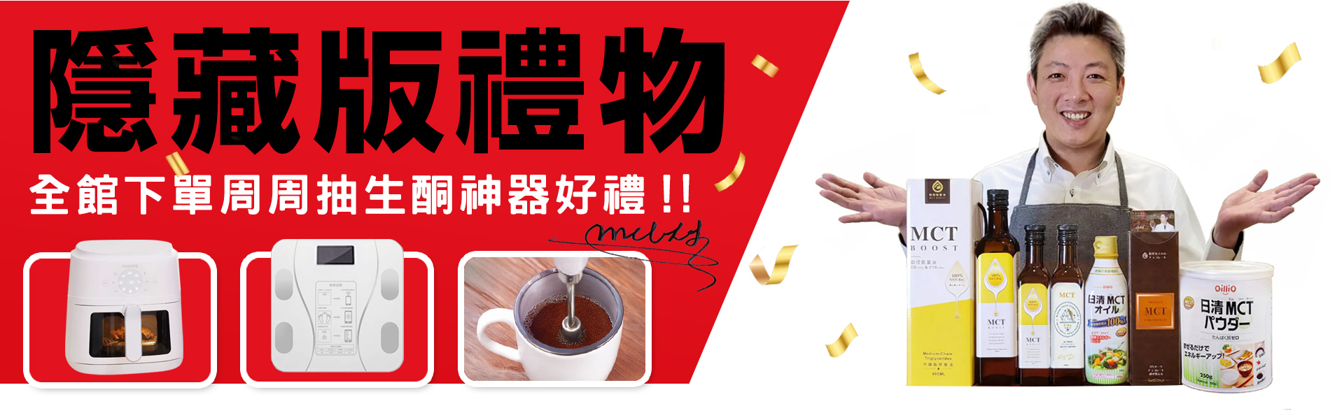 年中慶抽獎大放送!下單追加好禮重大聲明:MCT先生以愛之名寵粉回饋,身為品油師兼咖啡鑑定師特別嚴選生酮控必收的多款白色家電好禮,官網凡是購買任一瓶中鏈脂肪酸油,收到後開箱拍照回傳粉絲團,就有機會獲得以下贈送獎品,其中下單禮「 防彈咖啡攪拌器 」採隨貨寄出保證人人有獎,感謝祭補貼不手軟,好評延長加碼再加碼別見外囉 (笑)