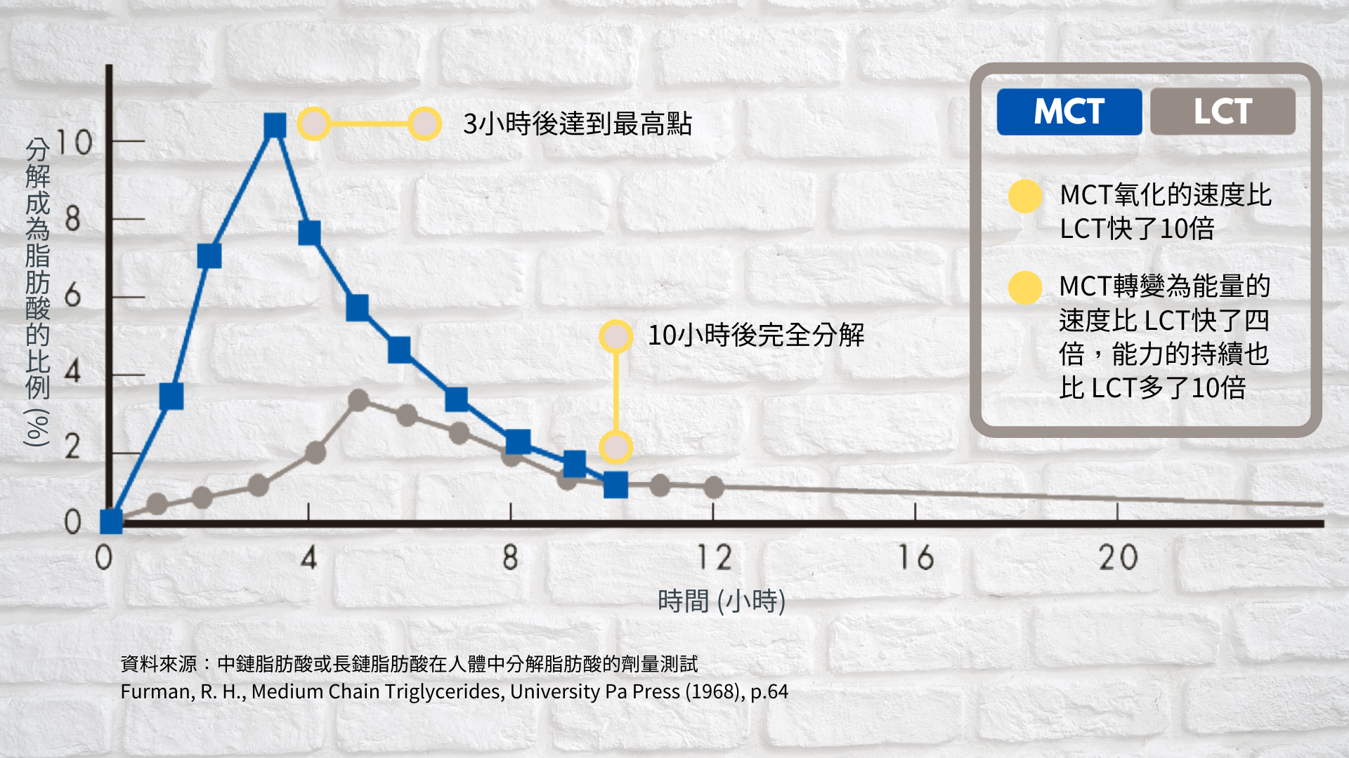 由於食物中的脂肪大部份是由長鏈脂肪酸 (LCT) 所組成,代謝時必須經過26個複雜的步驟分解成乳靡微粒才能進入淋巴系統。相對MCT則只有3個步驟,直接由肝門靜脈循環運送到身體的各部位,而蒸氣化後冷凝的MCT分子小,好分解於體內,不需要肉鹼就能夠進入粒線體,堪稱最乾淨能源,能夠迅速被轉為能量。研究中也顯示MCT在經過β-oxidation速度比LCT快10倍、轉換能量的速度也比其強4倍!由此可見,強生酮、快吸收,中鏈勝過長鏈,蒸餾萃取遠勝冷壓初榨!