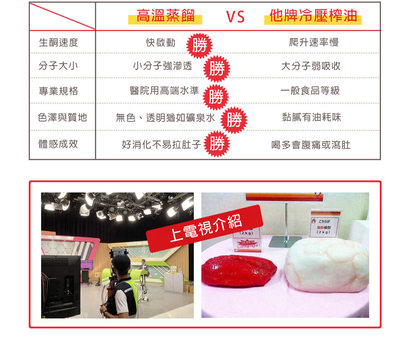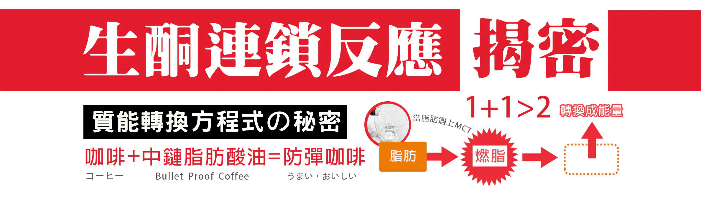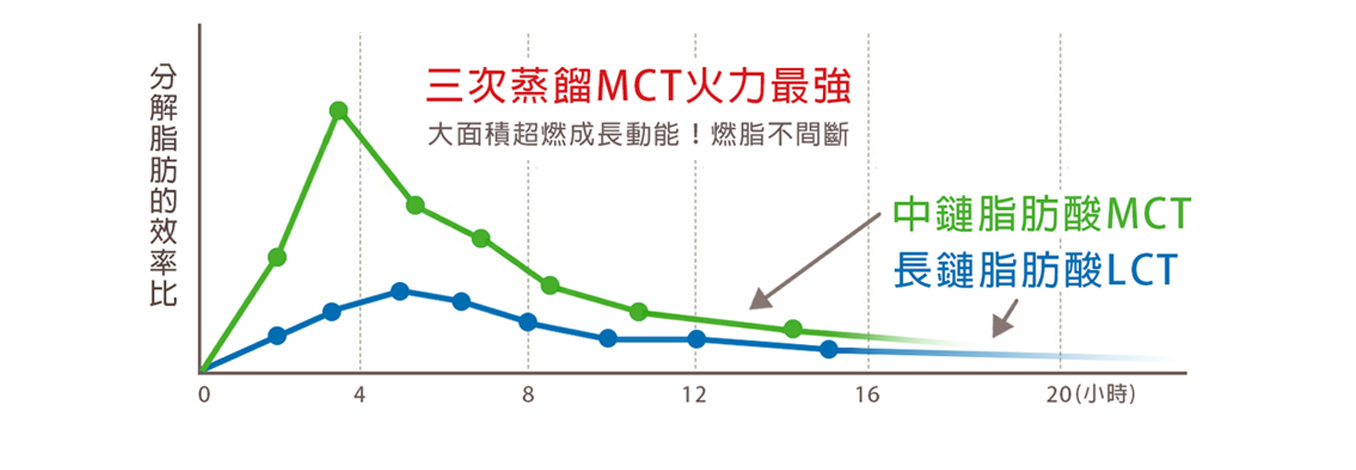那為什麼常聽到MCT可燃脂?請試試看把生酮想像成光合作用時植物透過自身葉綠素機制,會把二氧化碳轉換成氧氣,而人體內酮體也是同樣道理,啟動生酮連鎖反應就能順利把脂肪化為能量,其中三次蒸餾MCT因為分子量小、滲透力最強,誘發生酮奇異點的推波助燃轉換效果,掀起好評如潮,MCT先生還上台灣、日本等各大電視節目介紹,對於最常被問到的減重問題,特別提醒下:同等重量比 ▶ 脂肪體積的膨脹是肌肉三倍,想要激活燃燒體脂肪,補充好油才能越燒越旺盛