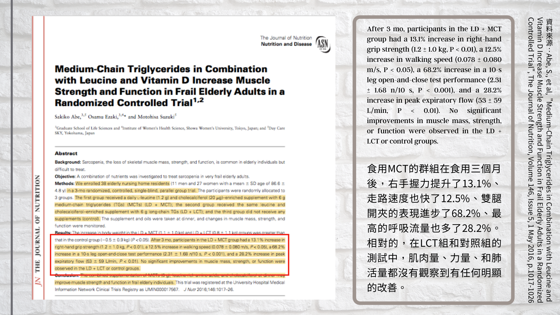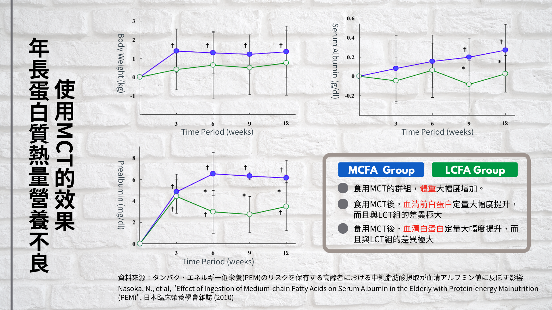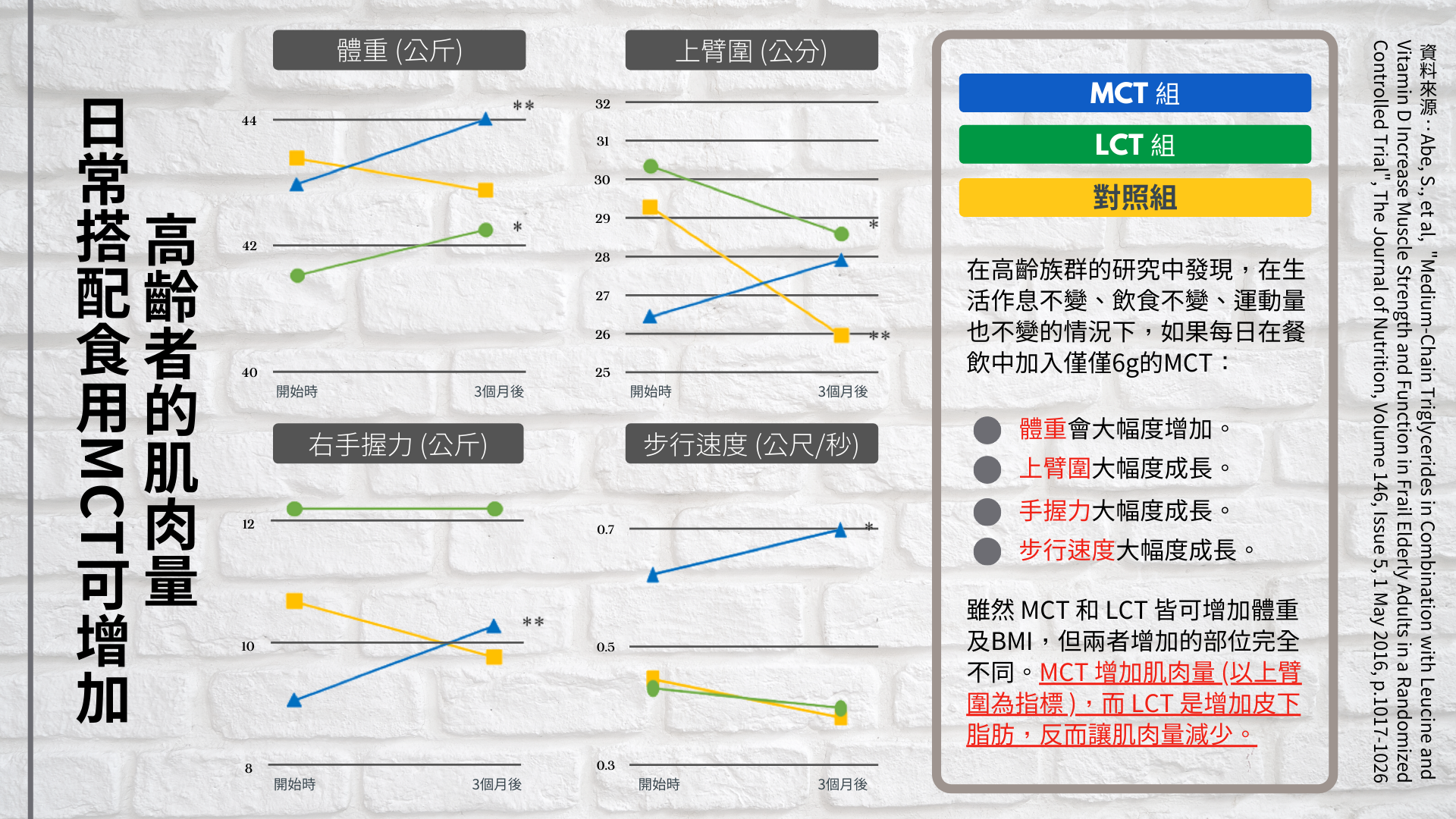 除了補充營養和適當增加運動量以外,醫學研究發現,持續三個月在日常飲食中加入僅僅6g的MCT油,能幫助高齡者改善肌四肢無力的狀況。長者在研究期間的飲食及運動量完全不變,只要每日食用MCT,右手握力增加了13.1%、步行速度快了12.5%、雙腿開夾的表現進步了68.2%、呼氣流量也多了28.2%,顯示MCT除了能夠補充能量,也能改善了老人家的營養不良及虛弱問題。相對的,在LCT組和對照組的測試中,肌肉量、力量、和肺活量都沒有觀察到有任何明顯的改善!