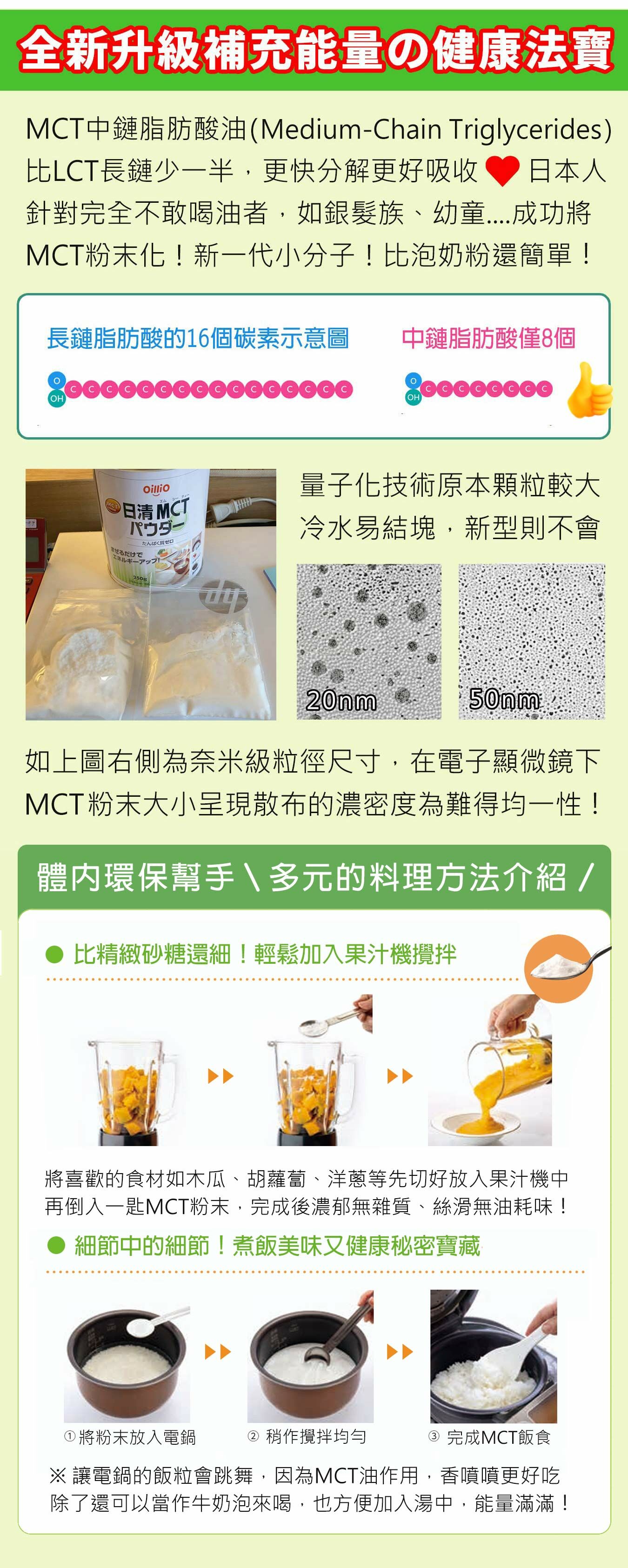 【產品三大特點】 1. 含75%中鏈脂肪酸油 (MCT,Medium-Chain Triglycerides),直接沖泡也可暢飲如牛奶質地 2. 來自日本最大製油企業日清OilliO,2025全新量子化蒸餾空運來台,日本國民品牌居家必藏推薦 3. 粉狀好沖泡好攜帶,徹底解決恐油症的不敢喝油問題,歡迎能量粉末和能量油交換使用,輕鬆解決年長或年幼兒童怕油的心理陰影 |